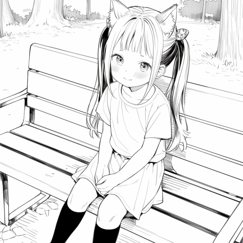 in 90´s manga style high angle full body little girl twin tails straight hair cat ears smiling sittin on a bench black and white thin lines --niji 5