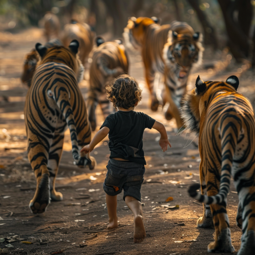 a child wearing a black t shirt and black trousers, of fair complexion running away from multiple tigers, shot is taken from directly in from of the child, you can see the child and tigers in the shot and the child is closer to the shot, shot by sony fx30, 300mm, 8k, --ar 9:16 --v 6.0 --style raw