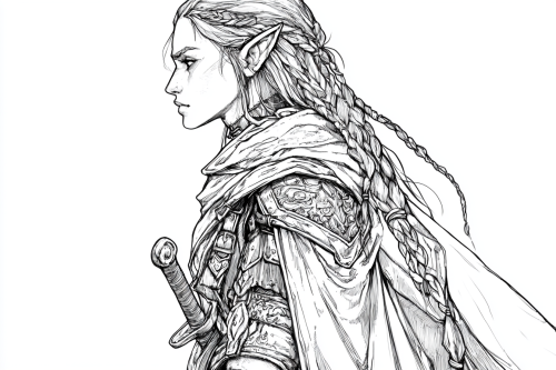 D&D style elf, dressed in realistic clothing from the proto renaissance period, black and white, line art, white background, full body in image, --ar 3:2