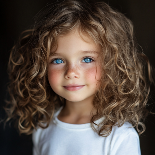 Take a photo of a 5-year-old child who is white, with blue eyes, dark blonde and curly hair. This child is a girl and is smiling for the photo. His hair is long.