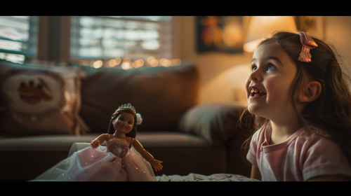 photorealistic image of a child, age 9, in her home living room having fun looking directy at and speaking directly to a 16 inch princess doll toy which is speaking to the child. Ambiance of the image is one of fun childhood, imaginative play, and positivity. --ar 16:9