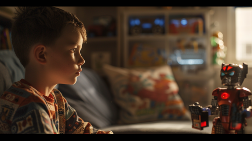 photorealistic image of a child, age 7, in his brightly-lit home, smiling, looking at, and speaking directly to a space war droid action figure. The action figure toy is also speaking directly to the child. In the background is overlay imagery representing a space war-style storyline. Ambiance of the image is one of fun childhood, imaginative play, and positivity. --ar 16:9