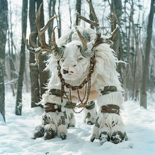 realistic photograph of a child wampa with multiple crooked antlers, wooden teeth, and a chain around it's neck in a winter forest