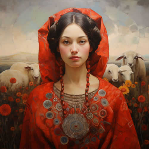 ancient Andean woman eating empanadas, abstract ceviche, Peruvian folklore mask, Andes mountains, pop surrealism, Andean patterns, vintage photography, realistic textures
