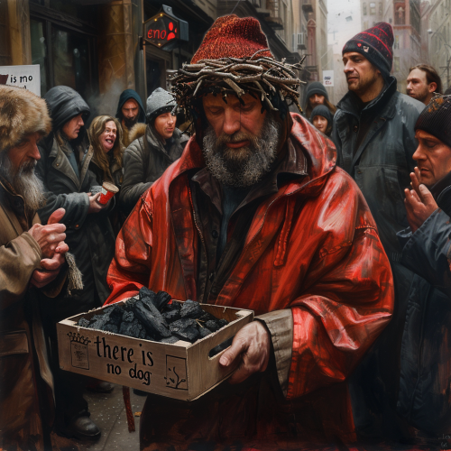 Jesus unwrapping a box of coal of Christmas morning with God laughing at Jesus, sad Jesus, a crowd of atheist protesters outside with signs that say "there is no dog" --v 6.0 --s 250