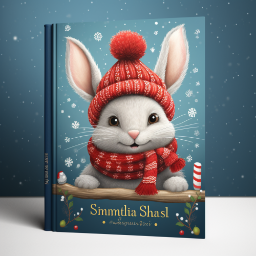 A Christmas storybook cover with the title "Christmas of a Little Rabbit" in fun. The illustration shows a cute smiling rabbit in a winter hat and scarf surrounded by holiday decorations. Children's book style.