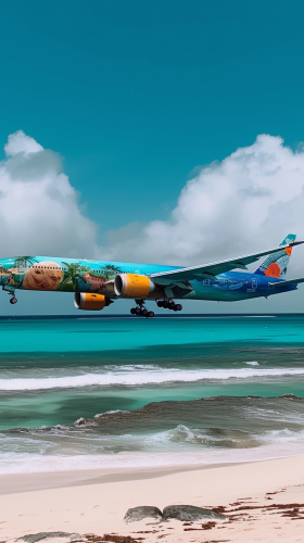 a photograph of a happy couple with several pets having a wonderful time in Hawaii on vacation on the beach. There are collaged-on, cartoon-like, brightly colored tropical flowers like hibiscus, gardenia, and plumeria on the photograph. Finally and most importantly, create a composition where most of the subject matter of the overall image are placed on the left third and the right third of the overall image, while the central third is heavily de-emphasized.