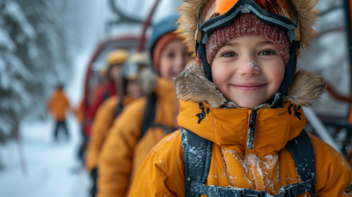 Full length photo. Happy adults and children at a ski resort. 2024. Multi-colored ski suits, cable car. white balance 5500 16K --ar 16:9 --v 6.0 --s 750