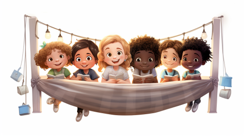 a hyper realistic and high-definition photo of happy, curious, and courageous 7-year-old girl and boy playing and reading in their bedroom. The bedroom is open to the Australian native bush, gum tree roots and moss spill into the room. Glowing leaves fall above the children and the golden pillars of sunlight. The suspended dust blooms and glows in the golden light. Evoke a sense of adventure in a world of limitless magic.