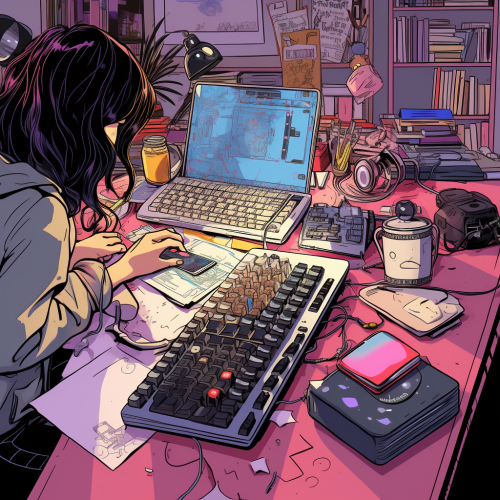 Girls Hands writing papers on desks, laptops, smartphones, vector art, cassette tapes, pepper,
