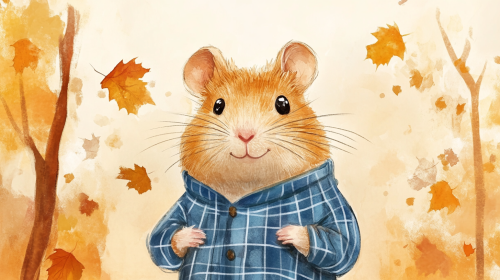 watercolor style, children's illustration, children's book illustration, portrait of a cute, happy hamster in a blue plaid shirt, with an autumn forest in the background --ar 16:9 --v 6.1
