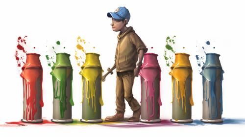 Drawing an illustration of the main character for a picture book, the protagonist is a tube of paint, mischievous, exuding an expert vibe, humorous, and lively, akin to an animated paint tube. Showcase four full-body poses of the paint tube character adorned in various colored clothes. Render the illustration using a drawing technique that mimics photography, set against a white background, maintaining a 16:9 aspect ratio. --ar 16:9 --v 5.0