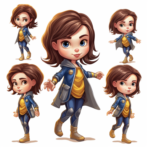 2.5 year old girl cartoon superhero character, multiple poses and expressions, children's book illustration style, simple, cut, full colour, straight brown hair --no outline
