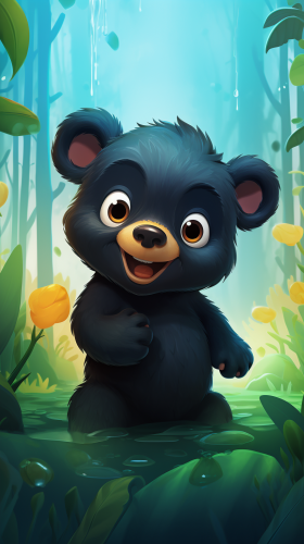 A curious cute LITTLE Black bear Cartoon character, big colorful eyes, intricate details, 3D, Children's book illustration style, tricolor gradient bright background --v 5.2 --ar 9:16