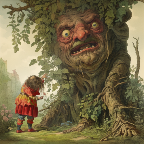 a giant hiding in the woods, beanstalk, fairytale illustration, colorful, children's book, 1700s
