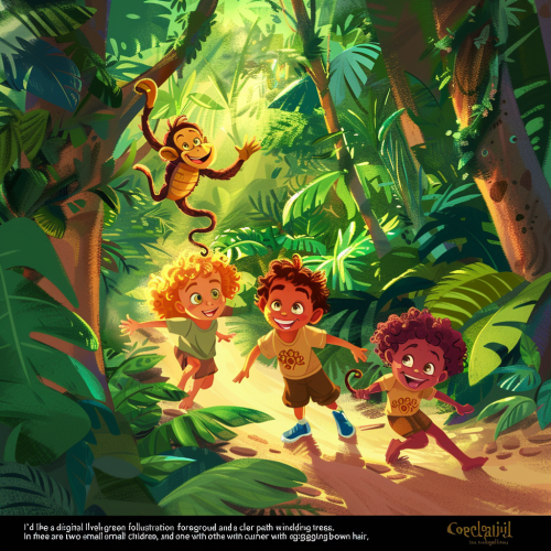 "I’d like a digital illustration depicting a lively jungle scene with lush green foliage and a clear path winding through the trees. In the foreground, there are two small children, one with short blonde hair and the other with curly brown hair, giggling and running along the path. Behind them, a mischievous monkey with a playful expression follows closely, swinging from tree to tree. The sunlight filters through the leaves, casting dappled shadows on the ground. I envision the overall mood to be joyful and adventurous, with vibrant colors and attention to detail."