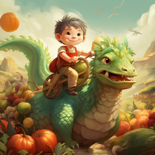 kid riding:: Chinese dragon made out of vegetables, in Spring time, in children's book illustration style