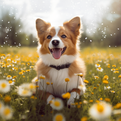 flat ear corgj orange with white spots mixed with a little merle australian sheperd in a field of dandelions
