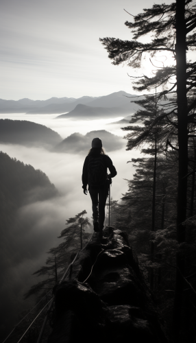 mountain climbing. Minimalist style. Asheville North Carolina. Autumn. Fall. Peak leaves. Golden hour. High-end. Stylish. Important. Mysterious. Black and white. Shot with a Pentax. K-3 III Monochrome. --ar 4:7 --q 0.5 --s 750