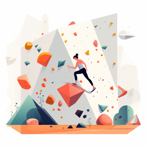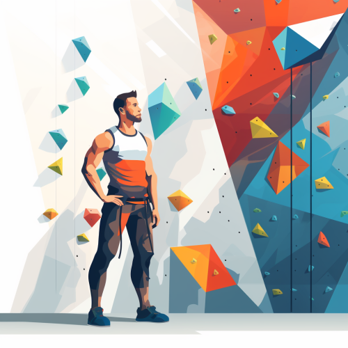 a man stand in front of climbing wall and thinking in a climbing gym, Flat 2D illustration, minimalistic, vector art, white background, white space –ar 3:4