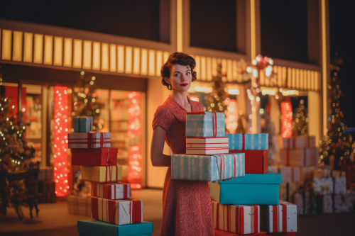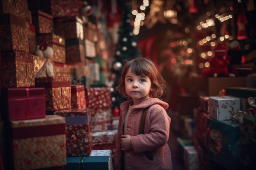happy toddler girl in Christmas dress, standing in front of the toy store, holding a huge amount of gift boxes in her hands, the boxes are standing one on top of the other, he has just left the Christmas toy store, Florida style, cinematic light --ar 3:2 --v 5.0