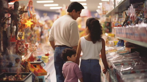 latin family walking buying at toy store in 1994, halloween, Disposable camera, colorful palette and neons --ar 16:9