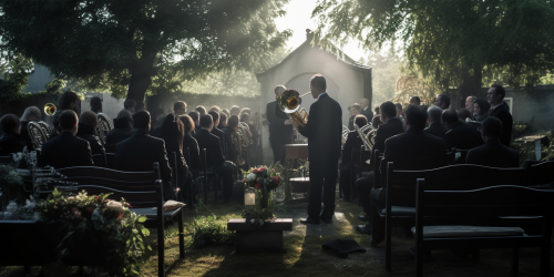 hyper relastic photo of a funeral with a band in the background, canon 40 --ar 2:1 --style raw