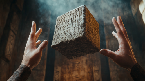 Create an image that showing player hands malipulating a 3 d stone etcher style block puzzle in the style of an ancient Sumerian artifact, suspended floating in MR --ar 16:9