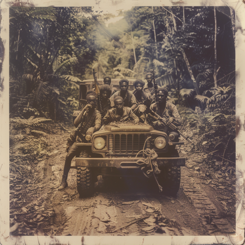 an old Polaroid of a group of black teens fighting in the war. The teens are doing cool poses in front a military vehicle on a long dirt road in the jungle. The teens are wearing military gear and handling assault rifles. Hyper realistic. --v 6.0