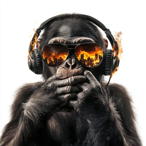 chimpanzee, with his hands covering his mouth with rayban sunglasses on with a burning city in the reflection of the sunglasses lense with dre beats headphones on; realistic lighting; tattoo realism design; zoom out 2x; isolated on white background with clipping path