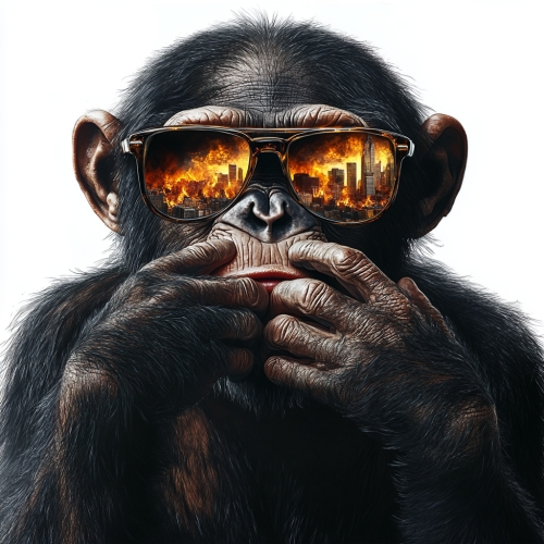 chimpanzee, with his hands covering his mouth with rayban sunglasses on with a burning city in the reflection of the sunglasses lense; realistic lighting; tattoo realism design; zoom out 2x; isolated on white background with clipping path