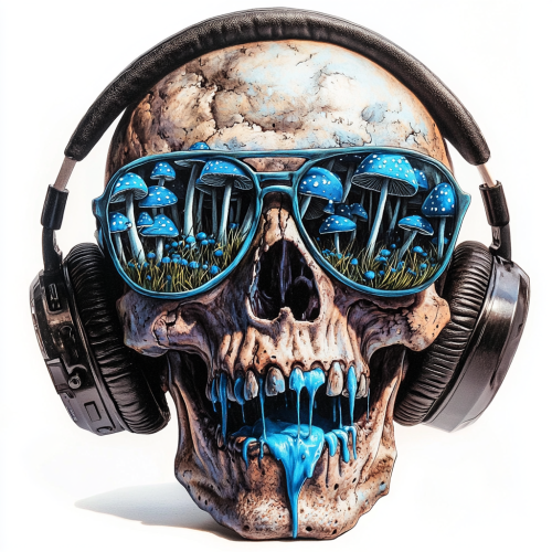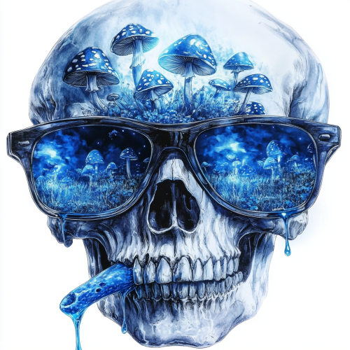 reaper, with mouth drips blue juice rayban sunglasses on with a field of blue mushrooms in the reflection of the sunglasses lense with dre beats headphones on; realistic lighting; tattoo realism design; zoom out 2x; isolated on white background with clipping path