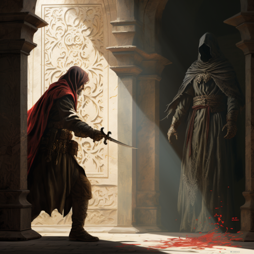 chinese female assassin holding a katana to defend herself against an army of goblins inside a medieval castle, fantasy, illustrated animation, middle earth