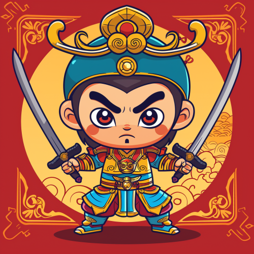 Generate a vibrant cartoon/chibi-style illustration of young ancient chinese soldier, Depict him in a ferocious and determined manner, maintaining the cartoon/chibi aesthetic. Use a color scheme with vibrant and energetic tones, different from blue. Emphasize stylized traditional Chinese warlord attire with fierce features. Keep the background simple to enhance the cartoon/chibi styletang. Ensure a bce between cuteness, ferocity