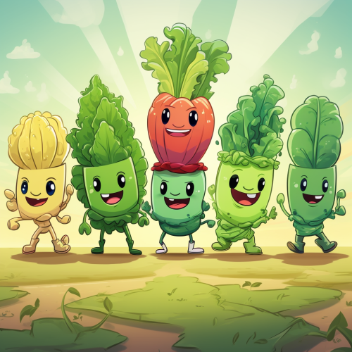 rugula, spinach, romaine, etc. in the style of cute, funny, whimsical cartoon characters, they're standing and have legs and feet, colorful farm background, glitch effec