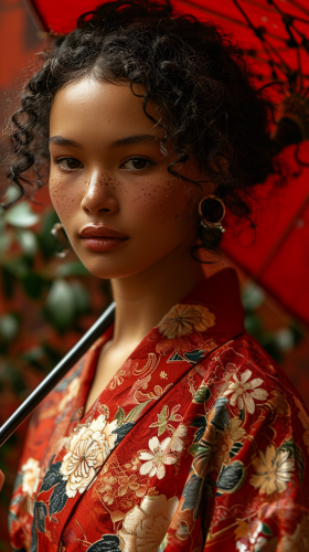 a young model dressed in Japanese and Afro American clothing is posing with a umbrella in front of a red background, snowflake. solid color red background, Excellent skin texture, Smiling expression, cheerful atmosphere, in the style of eye-catching resin jewelry, Beauty product advertising, photo studio, the stars art group, xing xing, matte photo, minimalist beauty, meticulous linework precision, feminine beauty --ar 9:16 --style raw --stylize 900 --v 6.0