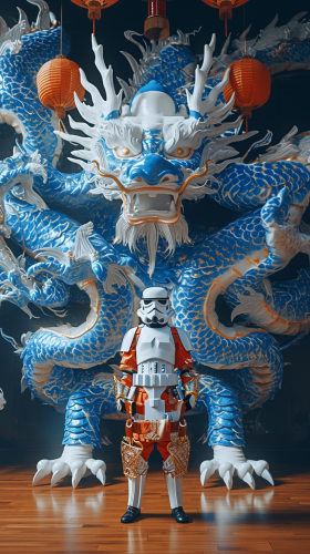 drone view, in front of a blue and white porcelain dragon stands a Star Wars storm trooper, gold foiled, wearing a red Chinese ancient armour, grand scene, minimalism, Chinese dragon, G4d rendering, surrealism, meticulous design, asymmetrical balance, master work, movie lighting, ultra HD, fine details, color grading, 32K HD, --ar 9:16 --v 6.0