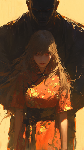 create one chinese girl wearing chungsam, with long flowing black hair, evil smile, positioned on blackmailing posture as if l she's a rouge thug. Create a black silhouette of a man in front of the girl, without any description, as if he is an extra, situate the girl within Abandoned ruins in the desert, dramatic sun light --niji 6 --stylize 750