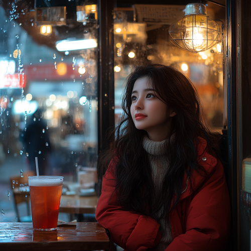 A Asian girl having a drink in a Korean cafe in red coat at night.The perspective is from sitting next to her. iPhone 16 pro --v 6.1 --s 750 --style raw