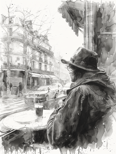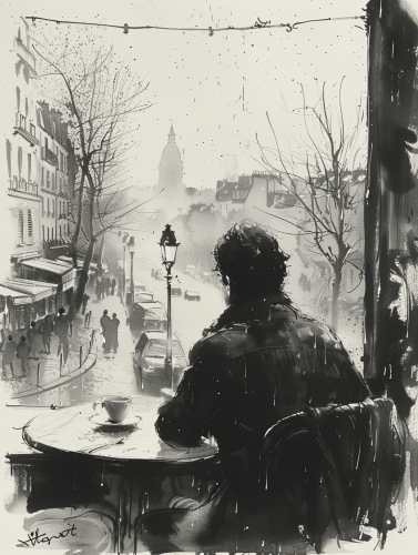 black and white sketch-storyboard, a man sitting at a table near a window in a cafe, the man looks out of the window:: a cup of coffee and a dessert on the table, a rainy cityscape outside the window --aspect 3:4 --v 6.0 --s 750 --style raw