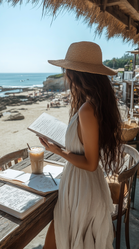 Female figure sketching in journal at beachside cafe, wearing flowy sundress, straw hat, iced coffee, ocean breeze moving hair, shot from side --ar 9:16 --style raw --s 250