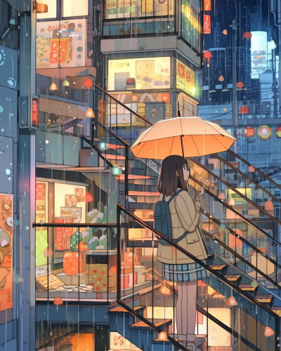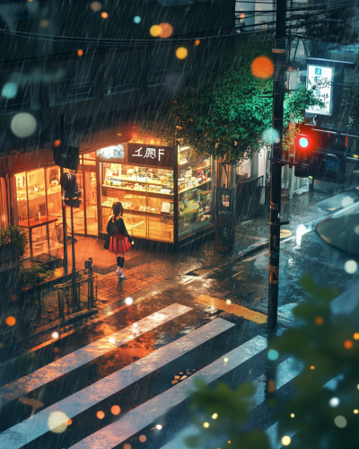 bird eyes view , A girl looks up at the sky under the eaves of a cafe. Rainy day in Tokyo. Crosswalk and traffic lights. Japanese animation style --ar 4:5 --v 6.1