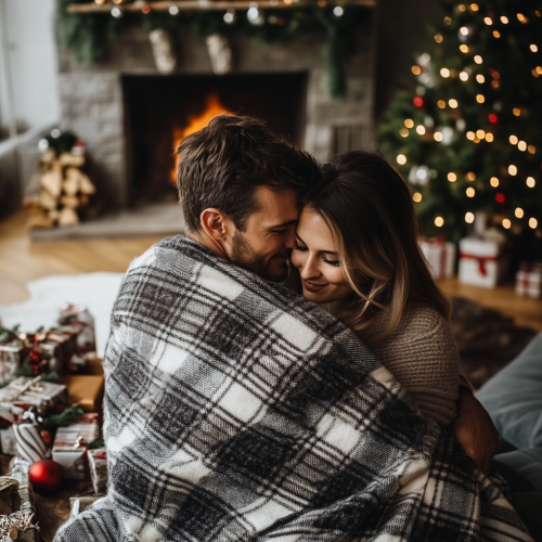 A photo of a couple wrapped in an elegant plaid blanket, the blanket's background is grey color with white lines, sharing affectionate moments in the style of the fireplace and Christmas tree. The room is decorated with festive decorations, creating a cozy atmosphere perfect for Christmas celebration. In front, there are some gifts on the table.