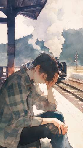 A picture using a more structured and bold watercolor style. A young man with short dark hair, wearing a plaid shirt and holding his head in his hands, sitting on a wooden bench at a remote train station. The train he missed is far in the distance, with a plume of smoke rising. --ar 9:16 --niji 6