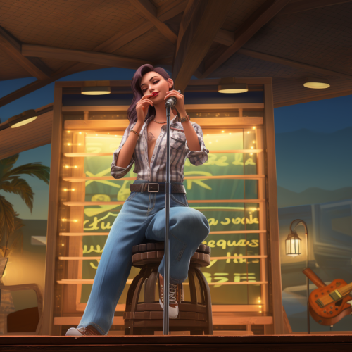 singer at kareoke in a chinese bar she's up on stage in her costume of jeans and plaid shirt, done in dali style the building is art deco style pale colors but signage is bright, and trees exotic