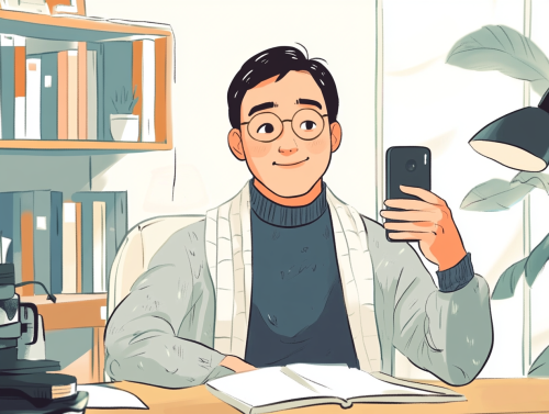 A 36-year-old Chinese headsome man wearing glasses is sitting at a desk, video calling his wife. He is holding the phone in his right hand and facing the cam, captured in a medium shot.With the background is a book shelf in his studio, creating a warm and cozy home atmosphere,medium shot, slightly looking down perspective, comic book style --ar 4:3 --v 6.1 --seed 2782952039