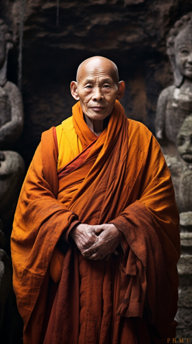 [c003fbbb4] A Chinese monk in his sixties or seventies stands in a picturesque mountain stream, hands clasped. --v 5.2 --ar 9:16 --c 0