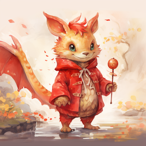 A cute dragon, in a red coat, in a Chinese New Year’s scene, pay a New Year call, watercolor painting style, full body picture, warm-toned, festival feeling, natural light, 1080*1920 pixel, high definition