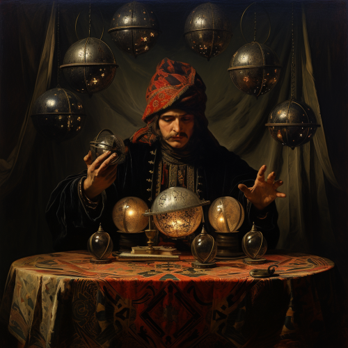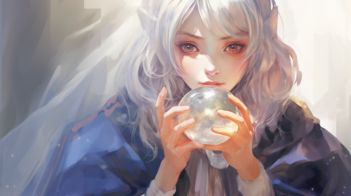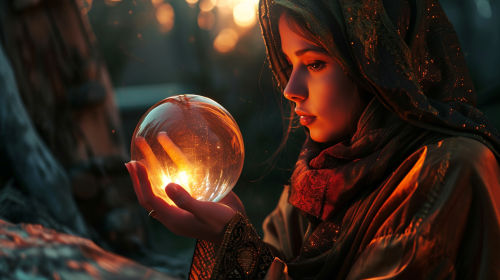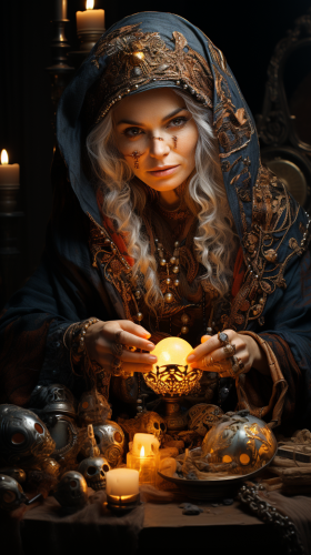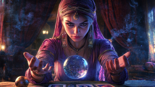 fortune teller with ball of the future, in a epic and medieval ambient --ar 16:9 --v 6.0