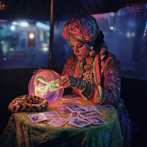 Legendary female fortune teller. In her hands, crystal balls, tarot cards, and a mysterious background.32K,HDR, ultra detailed, high definition --ar 16:9